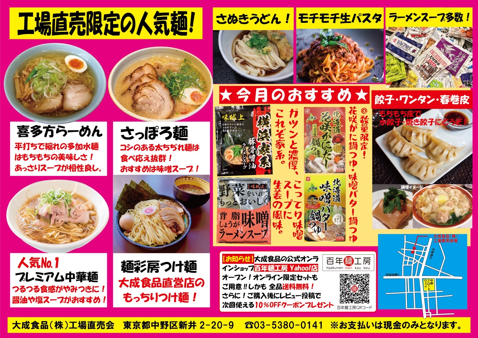 は令和8年 1月24日(土)17−19時、25日(日)10−16時第172回 工場直売 大成麺市場 を開催します。