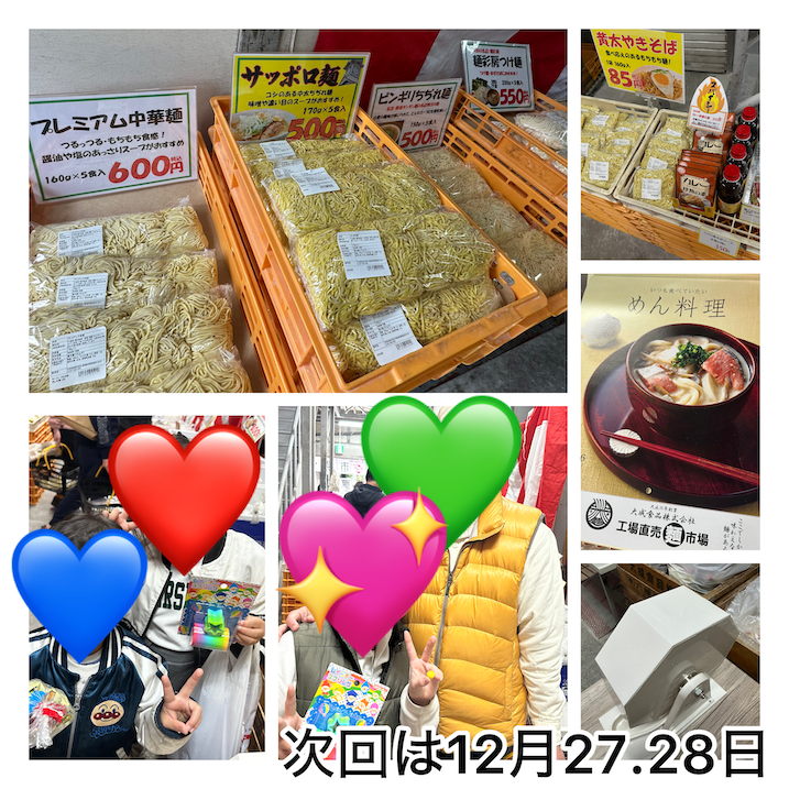第171回 工場直売大成麺市場は12月27日(土)17−19時、28日(日)10−16時 本社工場内特設会場で開催予定です。