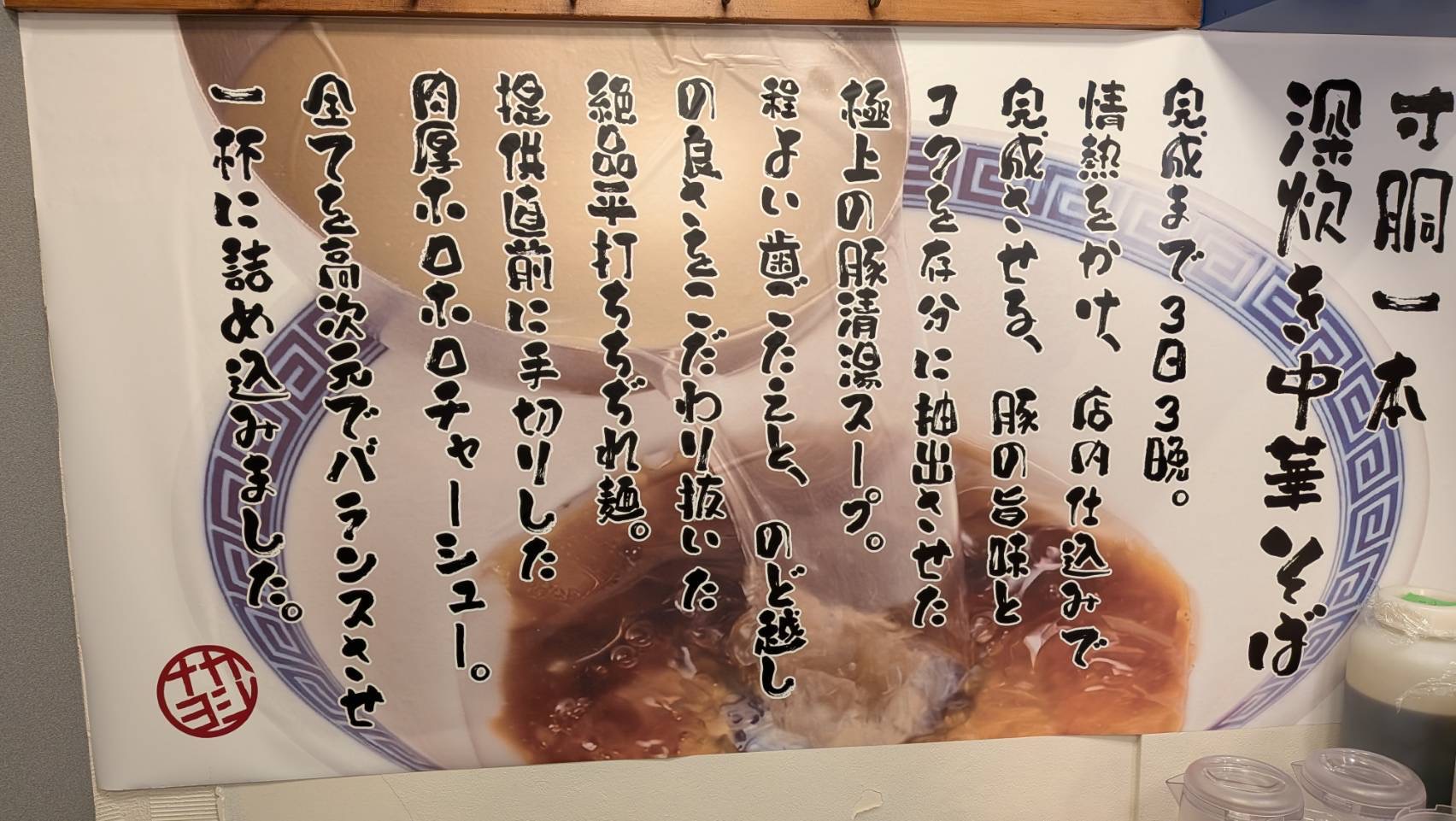 お店のInstagramによれば、「3日かけて完成させる、店炊き豚清湯スープに平打ちちぢれ麺のたっぷりチャーシュー中華そばがウリ!!どこか昔懐かしさを感じさせつつも古さを感じさせない本格中華そば専門店」とのこと。